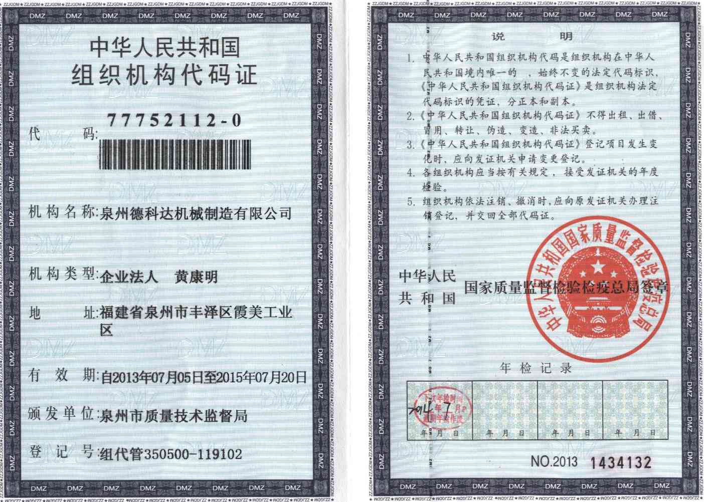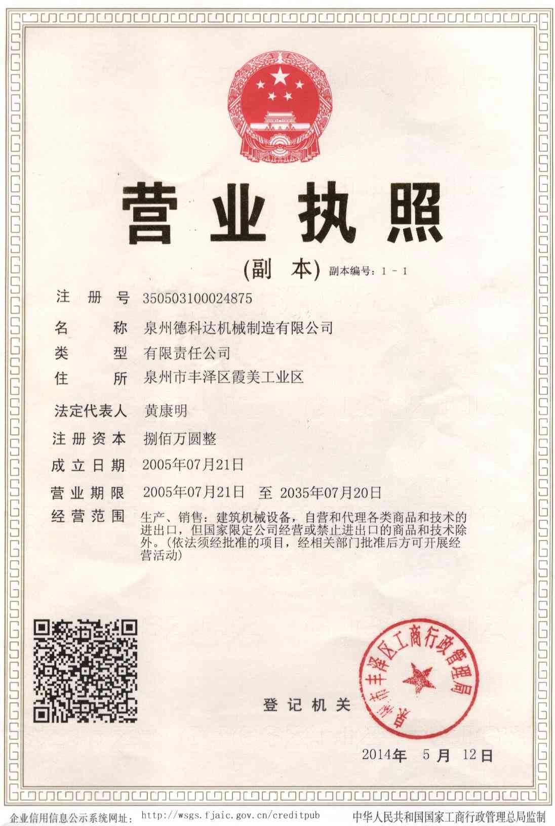 泉州德科達機械制造有限公司資質證書